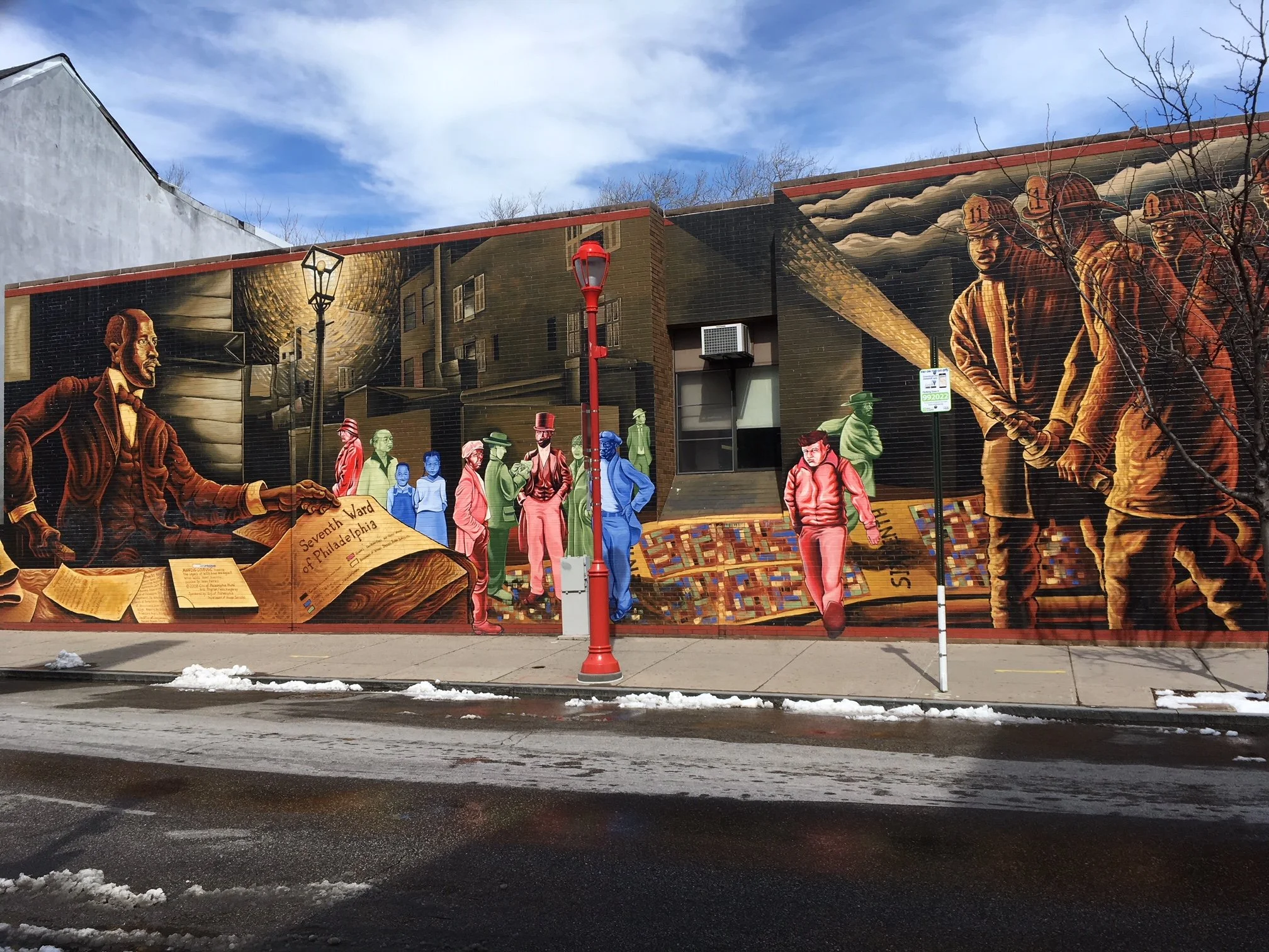 This colorful mural called “Mapping Courage” is on South Street near 6th Street. It shows famous researcher W.E.B. DuBois, community members and area firefighters. Copyright 2008, City of Philadelphia Mural Arts Program/artist Willis “Nomo” Humphrey.